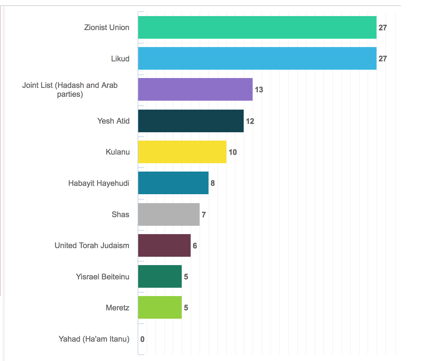 So, why does this break-down dictate that Bibi will almost certainly be the next Prime Minister? Simple: it’s all about the numbers. Israel’s Knesset has 120 seats. For a coalition to form a government, 61 seats are necessary and these polls dictate that there is no way that Herzog’s Labour, even at 24 seats, can form a lasting and stable coalition. His only natural partner is Meretz, with the possible inclusion of Lapid’s Yesh Atid, but that only brings him to a total of 43 seats (24+5+14). With 18 seats outstanding, he’d have to shop around. Assuming they can dangle enough out to Kahlon, that brings the grand total to 52 seats, still 9 seats shy of the magic 61.