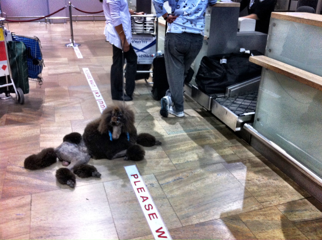 Emasculated poodle at check-in with curlers in his hair and owners from “Best in Show“. No.
